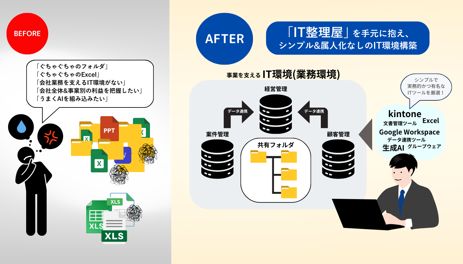 こういった高度な実務は、単に「言われた通りに作る」だけのIT業者には出来ません。また、「人間の細かい感情やクセ」「会社独自の文化」を理解出来ず、「相手のレベルに合わせた」対応が苦手なAIにも出来ません。