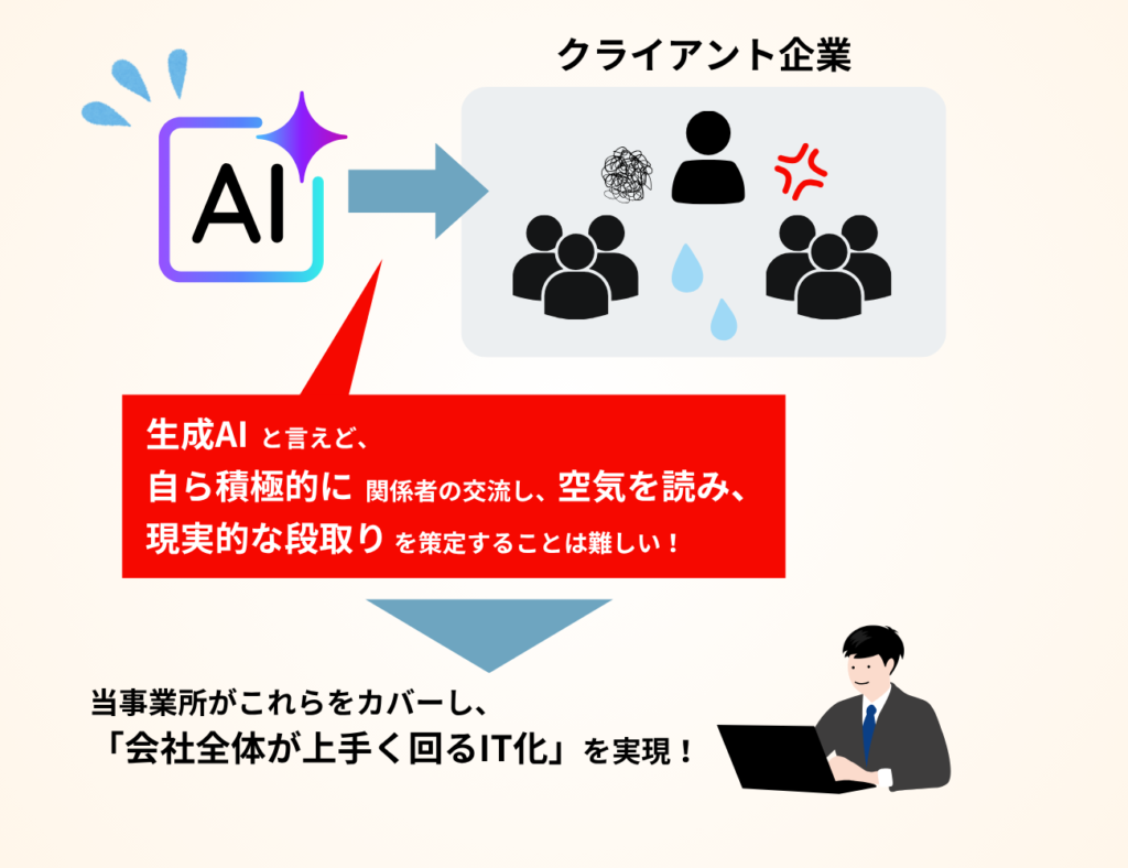 生成AIは、「個人の業務効率化」は得意としつつ、「自ら積極的に人間へ話しかけての交流」や「人間同士の複雑な感情・関係性、会社独自の事情・文化の把握」が苦手で、それらと向き合いつつの「現実的な段取り」を組むことが困難です。一方で、当事業所ではそれらを最大限考慮したアプローチで取り組むため、「会社全体が上手く回るIT化」という高度な価値を提供することが可能です。