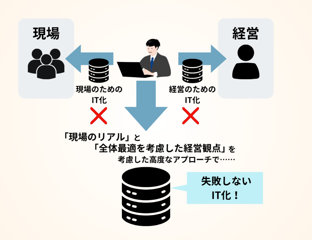 IT化検討においては、「現場のリアル」を理解せずに進めることで、失敗を引き起こします。一方で、現場観点だけでなく「全体最適を考慮した経営観点」までも持ち合わせないと、表面的なIT化で終わり、これも失敗に至ります。